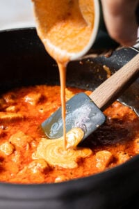 - Once the chicken is cooked through take some of your masala and add it to your yoghurt and then slowly mix the yoghurt back into the achar chicken.