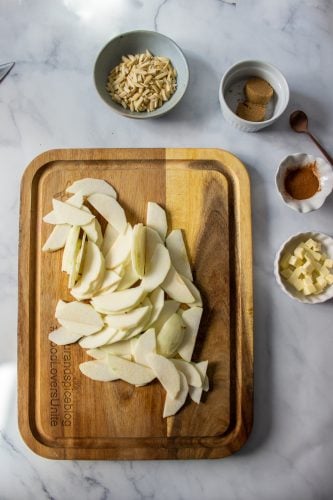 Scatter the brown sugar over top. Dot with butter and top with a sprinkling of cinnamon. Bake for 15-17 minutes until the edges are nice and golden and there is some oozy sweet magic happening. Top with the toasted almonds.