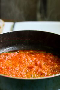 - Now add your diced tomatoes and cook, sauteing occasionally until the excess water dries and the oil rises above the tomatoes.