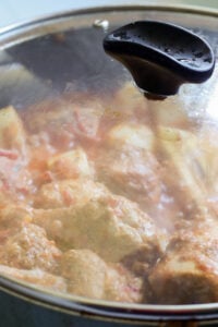- Add your potatoes, aloo bukharay (if using), half a cup of water, cover the pot, and bring it to a simmer, cooking for 25 minutes or so or until the chicken is tender. Check on it halfway through to see if the masala is sticking (add more water if it is), but otherwise there's no need to disturb it.