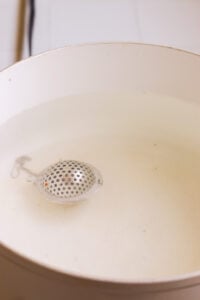 Halfway through bring a pot of water to boil and add in your salt, vinegar and rice spices however you choose to add them (loose, tea ball, or muslin cloth).