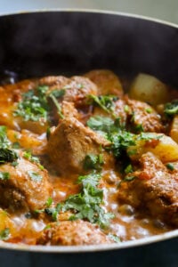 - When the chicken is tender, turn up the heat to dry out any excess water, turn the stove off as soon as it starts to stick a little and the oil is above the masala. I like to add half my green masala from the layering (mint, cilantro, chilies) now along with a squeeze of lemon juice.