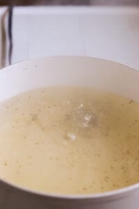 - 10 minutes into the chicken cooking bring a big pot of water to boil with the salt, vinegar and flavorings. I like to put my whole pepper, cumin seeds and chilies in a tea ball, but you can use a muslin cloth to tie them in or boil the water with them and use a strainer to pull it out if you don't want whole spices in there.