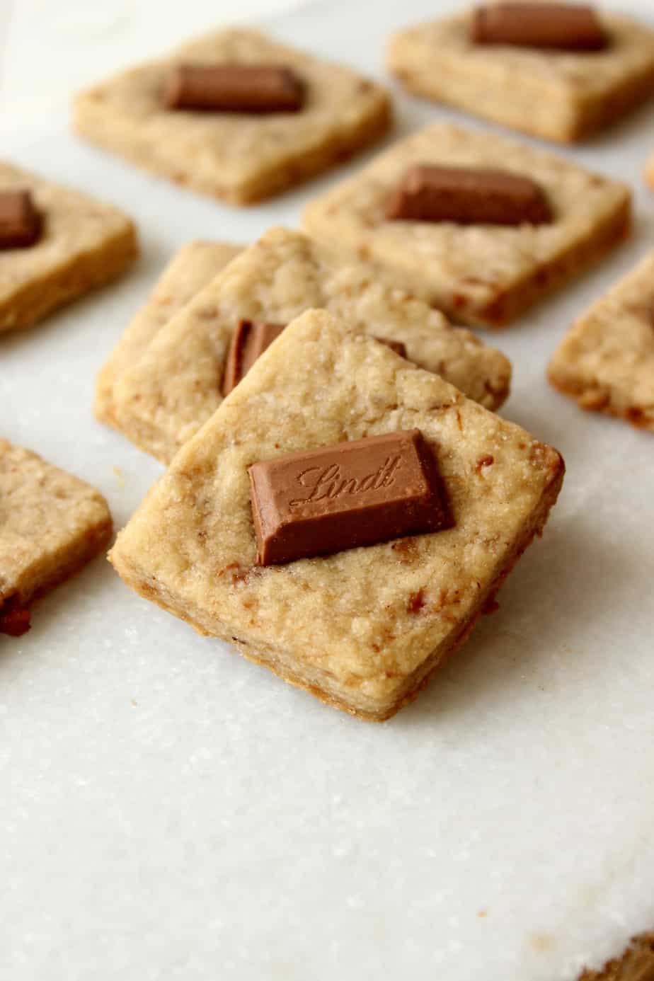The recipe sounded wonderful as written, but I have wanted to make a Coffee Shortbread Cookies for a long time and seized this opportunity. A fat pinch of instant coffee and some skor bits later I am a little in love. These Toffee Coffee Shortbread Cookies w/ Lindt are tender with a little crunch, subtly flavored from the coffee with beautiful notes of caramel. Fun fact: I usually drink my coffee black, but when I want something indulgent a caramel macchiato hits the spot. The flavor combination here is a mellow play on that drink. With a piece of chocolate on top, because well chocolate makes everything better.