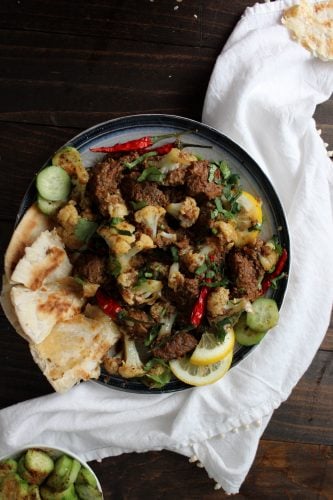 There are some foods that have a visceral appeal, where even before you take a bite, every sense of yours knows what to expect. The tender tear of the paratha, the firm delicate swoosh into the masala, a piece of bread picking up heady spiced beef and the gentler cauliflower. You know just how good it will be before you take your first bite. And then when you do it's tough to stop. In case you cannot tell because I am so subtle, Gobi Gosht is one of those foods for me. I can't remember if my mother made it (must ask), or when and where I discovered it, but I am undeniably a fan.