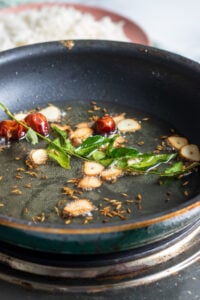 - Heat oil in a small saucepan and add the garlic, cumin seeds, whole dried red chillies and curry leaves (if using). Cook on medium high heat until the garlic is delicious golden then quickly pour over your daal and cover the pot with the lid.