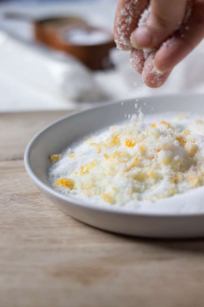 Step One: Rub the zest (if using) together in a bowl with the sugar, set aside.