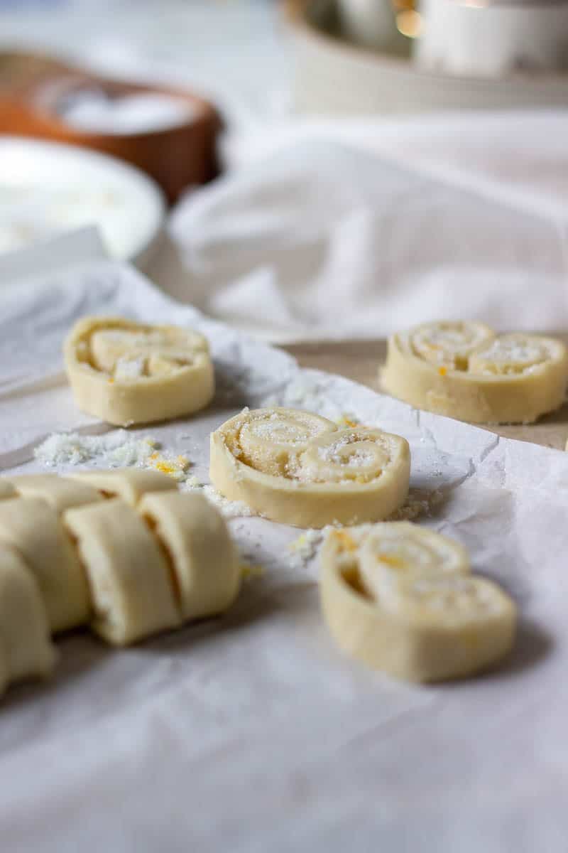 - If your puff pastry is still cold and firm then start slicing it into 1 cm slices and arrange the cookies on your prepped sheet about an inch apart