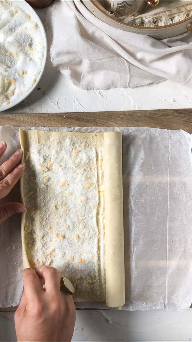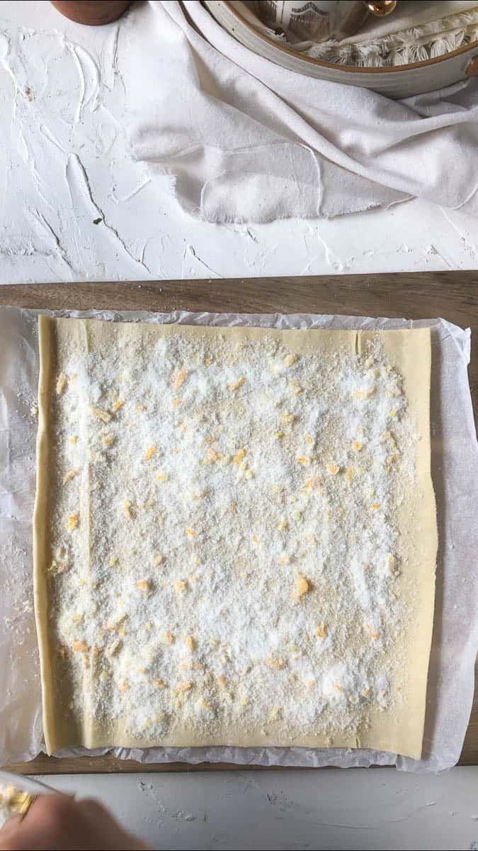 - Unroll your puff pastry sheet and scatter roughly ⅓ cup or an even layer of sugar over it