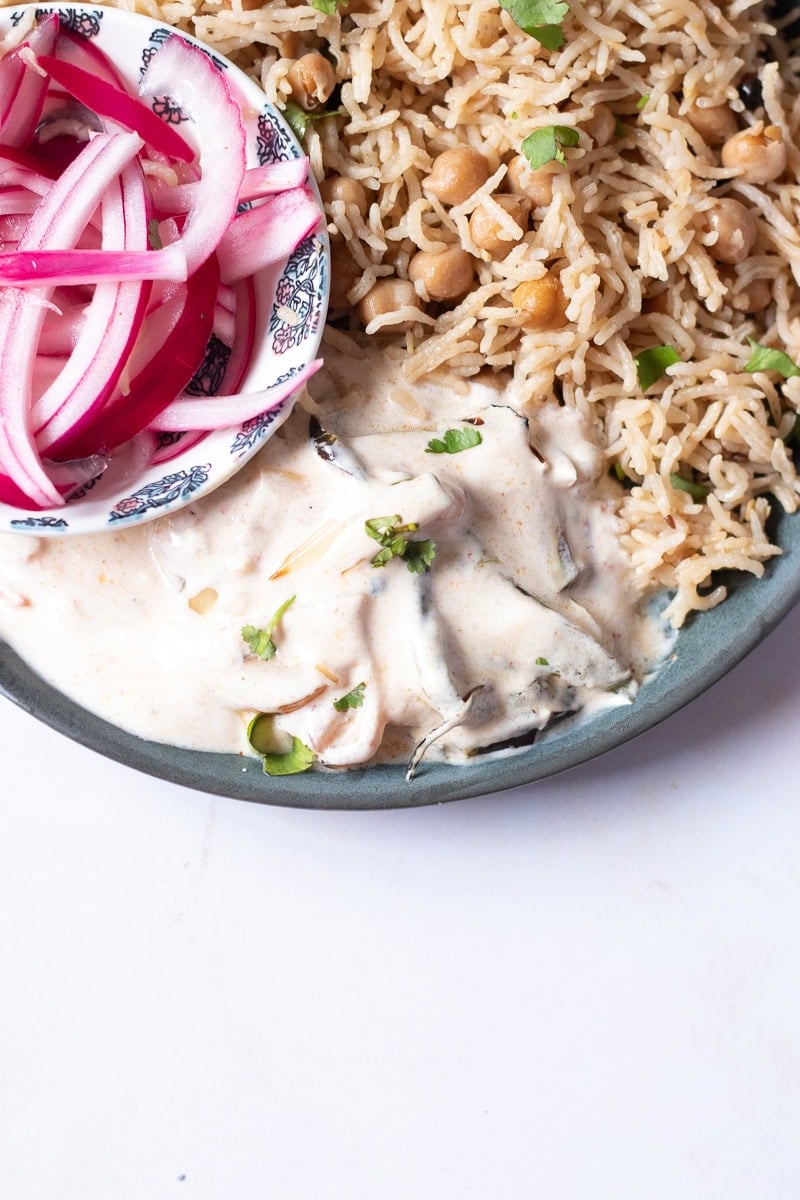Chana Pulao + Sabzi Raita + Achar Chicken. YUM.