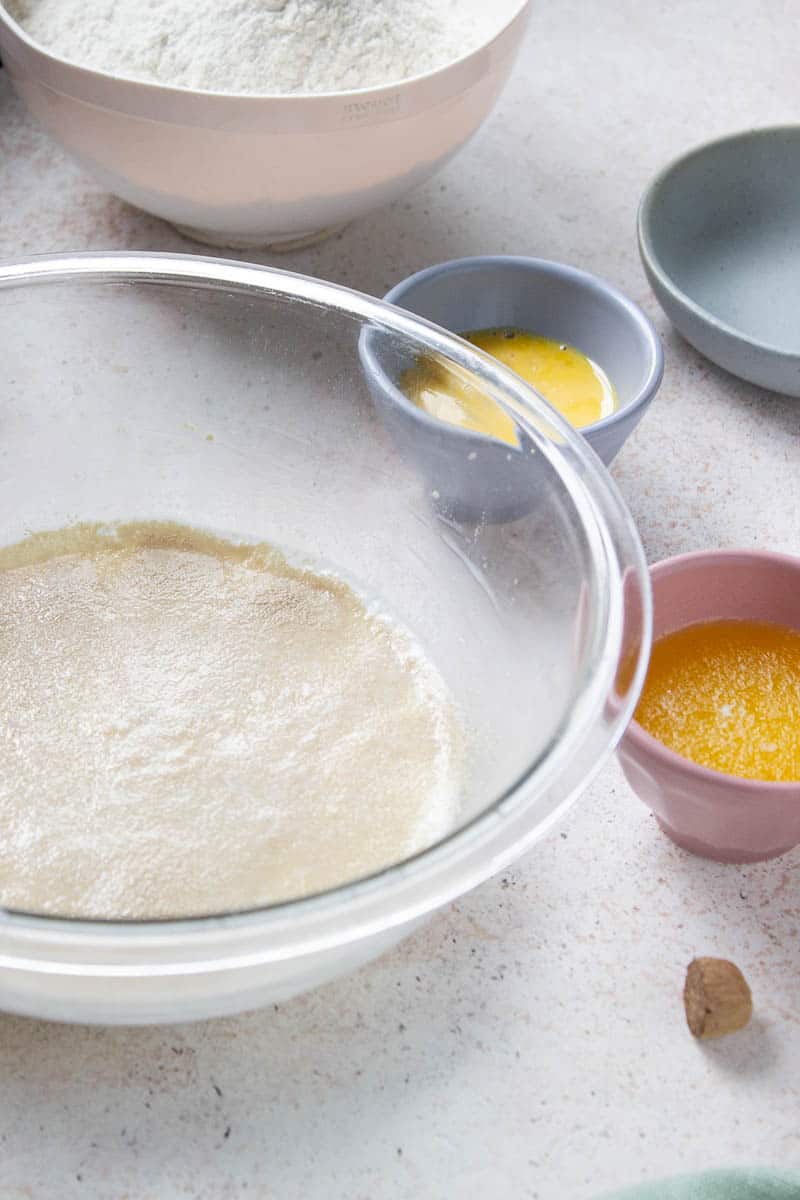 - Mix your warm milk and sugar in a large bowl, scatter over the yeast and let it stand for 5-10 minutes or until very foamy (it'll smell like you're baking bread)