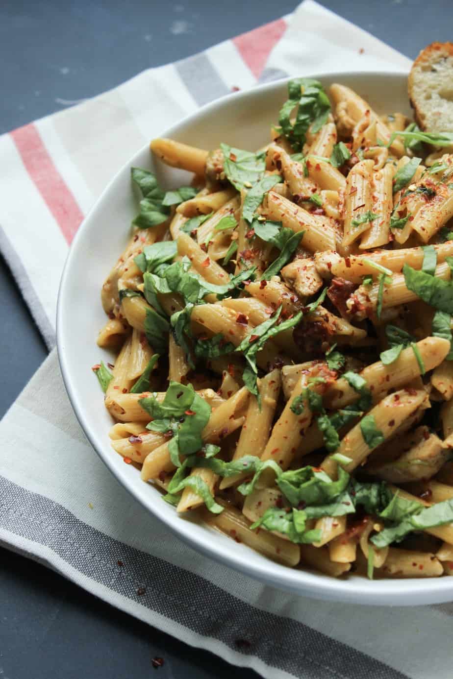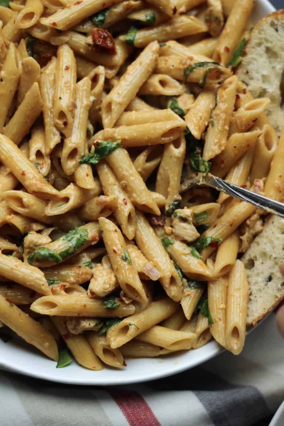 Names are important aren't they? When I first tested this recipe I thought of it as Tuscan Chicken Pasta and then when I sat to type it up I realized I was so wrong. Firstly this Sun-dried Tomato & Chicken Pasta has like half the cream of most Tuscan Chicken Pasta recipes. Now this is not because I am healthy, but because I find I don't like the heaviness that follows a surfeit of heavy cream although man does that stuff taste good sometimes! Secondly my kids don't like random chewy things in their pasta. That's how they described the glorious tangy sun-dried tomatoes the first time I made it. Random Chewy Things.